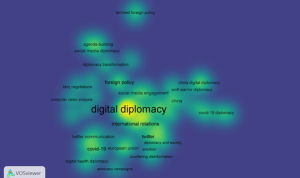 Kata kunci digital diplomacy muncul sebagai pusat kepadatan tertinggi dengan warna kuning terang, menandakan bahwa istilah ini menjadi fokus utama dalam kajian literatur selama satu dekade terakhir. Keberadaan international relations dan foreign policy dalam lingkaran yang padat di sekitar digital diplomacy menunjukkan keterkaitan erat antara konsep diplomasi digital dengan ranah kajian hubungan internasional dan kebijakan luar negeri. Hal ini mencerminkan kecenderungan para peneliti untuk membingkai diplomasi digital sebagai bagian dari dinamika hubungan antarnegara dan strategi diplomatik nasional.