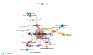 Dengan demikian, peta jaringan ini menggambarkan kompleksitas dan keluasan spektrum riset yang berkembang dalam bidang diplomasi digital, yang tidak hanya mencerminkan perkembangan teknologi, tetapi juga dinamika politik global, krisis kemanusiaan, dan evolusi nilai-nilai dalam hubungan internasional.