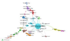 Secara keseluruhan, network visualization ini menegaskan bahwa politik identitas merupakan simpul analitis yang menjembatani berbagai dimensi sosial-politik, dari yang berbasis agama dan etnis, hingga yang berhubungan dengan institusi demokrasi dan arus globalisasi. Hubungan-hubungan ini menunjukkan bahwa kajian politik identitas tidak dapat dipisahkan dari kompleksitas struktur sosial dan dinamika politik yang membentuk masyarakat kontemporer, baik di tingkat lokal, nasional, maupun global.