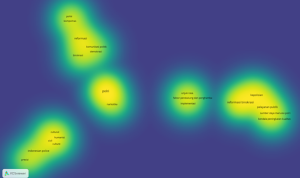 Visualisasi kepadatan (density visualization) memberikan gambaran mengenai intensitas atau konsentrasi penelitian pada tema-tema tertentu dalam diskursus akademik mengenai reformasi Polri. Dalam peta ini, warna kuning menandakan area dengan konsentrasi penelitian tertinggi (hotspot), sementara warna hijau hingga biru menunjukkan tingkat kepadatan yang lebih rendah. Berdasarkan hasil visualisasi, teridentifikasi sejumlah area utama yang menjadi fokus perhatian akademik dalam satu dekade terakhir.